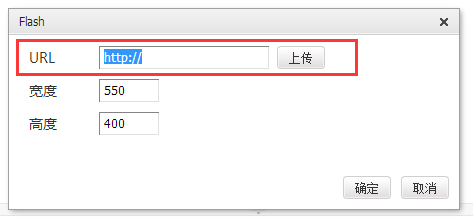 3、 点击Flash图标,将此前复制好的网址直接粘贴在URL栏中(不用点击“上传”及宽度高度),点击确定。