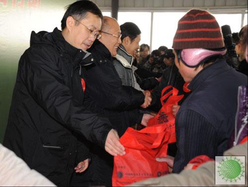 泛海集团助理总裁李亦明向务工者发放暖春礼品。